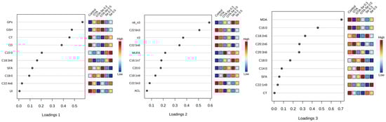 In the frame of the sPLS-DA analysis, we checked the top 10 most powerful loading items contributing to the spatial separations’ components. Figure 4 provides these loading plots with the most powerful biological variables. For component 1 the variables of the highest contribution to the separation were mostly antioxidants (GPx, GSH) and early lipid peroxidation markers (CD, CT); those for component 2 mostly contained FA groups (e.g., n3, MUFA), while those in component 3 were individual FAs and MDA.