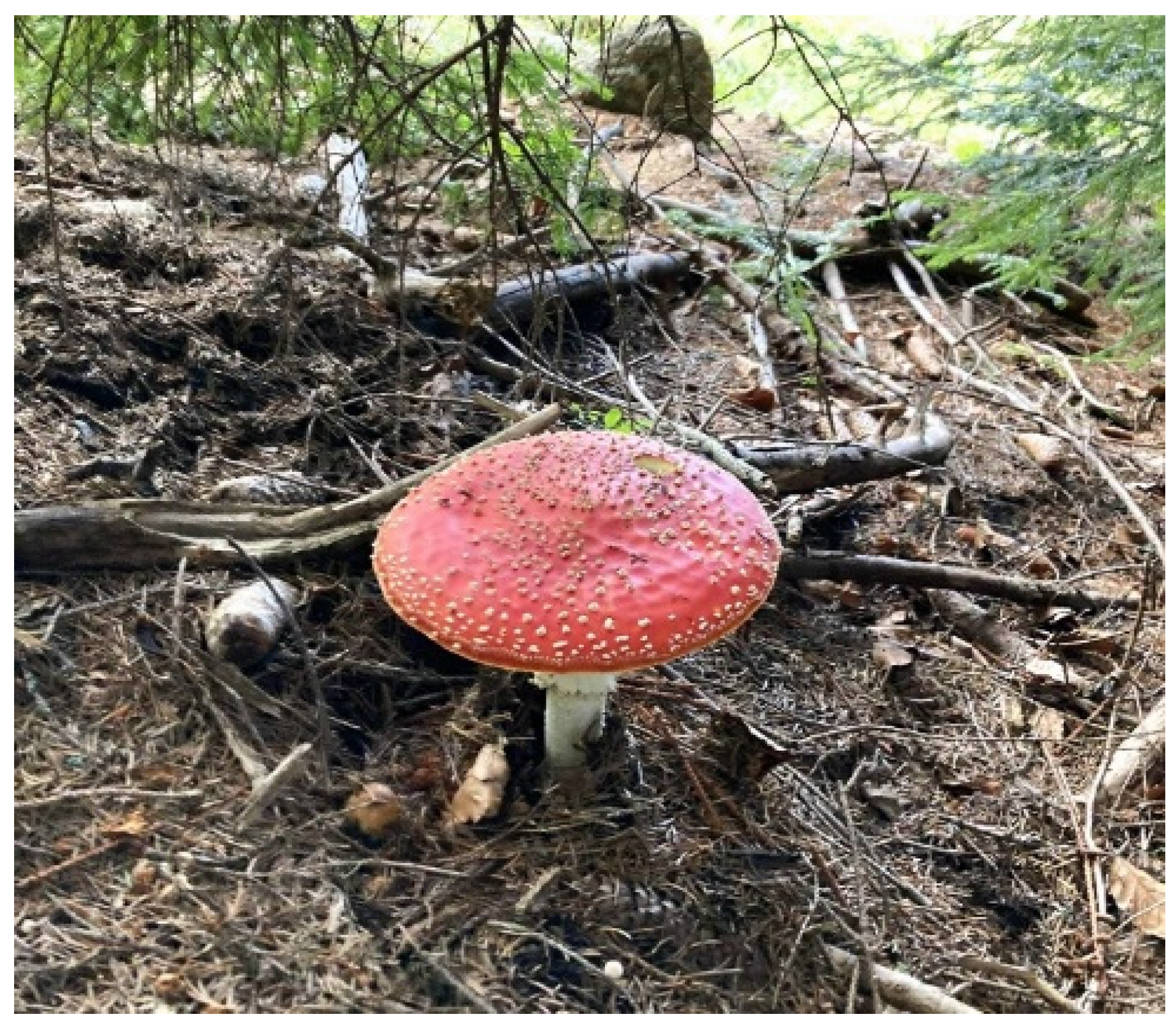 Amanita muscaria (L.) Lam. (A. muscaria) belongs to the phylum Basidiomycota, order Agaricales, and family Amanitaceae. The species exhibits considerable phenotypic diversity, particularly in cap coloration; nonetheless, it is most readily recognized by its bright red cap adorned with white warts—a visual hallmark that has become iconic in both mycology and religious symbolism (Figure 1). For centuries, the mushroom has been known in various cultures as fly agaric or fly amanita due to its traditional use in milk to attract and sedate flies through its bioactive compounds [5].
