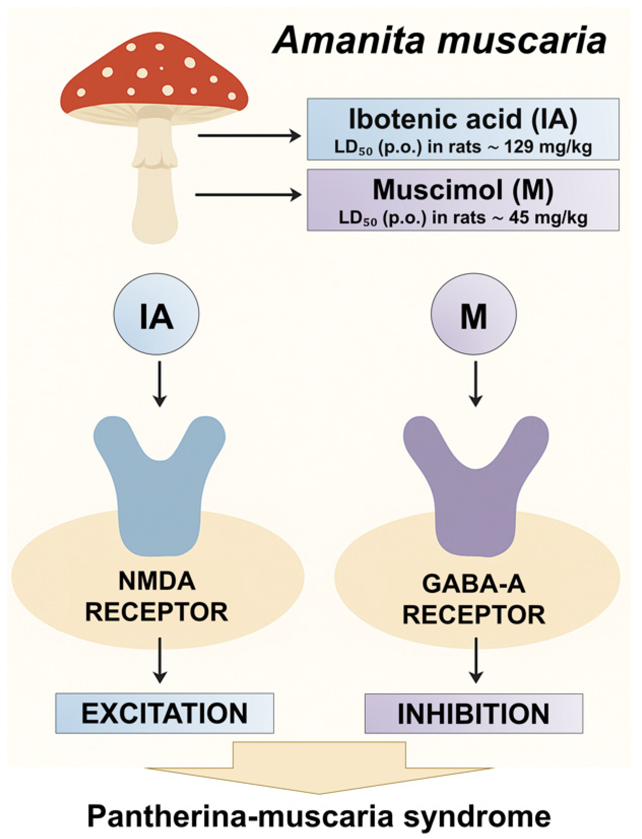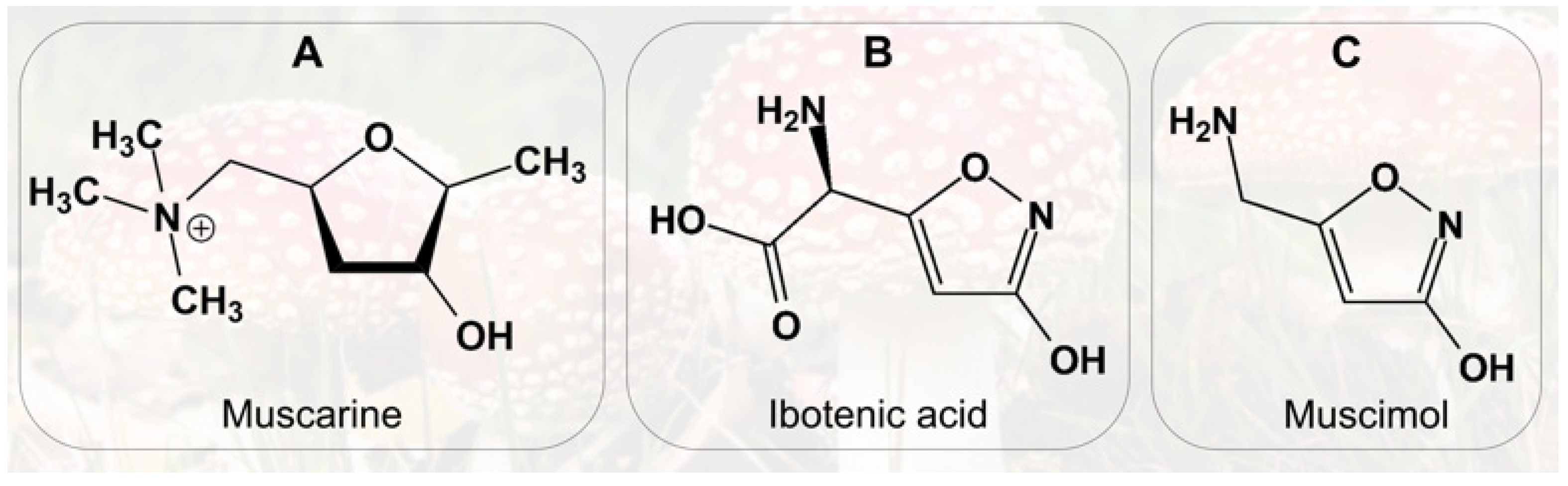 Chemically, muscarine is a quaternary ammonium alkaloid first isolated in pure form by King in 1922, with its structure elucidated by Keogh et al. in 1957 [18]. It is present only in trace amounts in A. muscaria, primarily within the basidiocarps (~0.02% of dry weight), accounting for its minimal contribution to overall toxicity. Despite its low abundance, muscarine represents a compelling toxicological model due to its pharmacodynamic properties [19]. It is water-soluble and thermally stable, retaining activity upon culinary processing [1]. Pharmacologically, muscarine functions as a non-selective agonist of muscarinic acetylcholine receptors within the parasympathetic nervous system. Its partial resistance to cholinesterase-mediated degradation prolongs its action. The presence of a positively charged quaternary amine prevents muscarine from crossing the blood–brain barrier, thereby precluding direct central nervous system effects [18]. Clinically, muscarine predominantly mediates peripheral autonomic symptoms in A. muscaria poisoning, including hypersalivation, hyperhidrosis, bradycardia, and diarrhea, typically mild and reversible, but capable of inducing severe cholinergic crises at high doses. Consequently, muscarine plays an ancillary role in the overall toxicological profile, while central effects are chiefly mediated by ibotenic acid and muscimol (Figure 2B,C) [10]. The red cuticle and underlying yellowish tissue of the mushroom contain the highest concentrations of these compounds [20]. Approximately 10–20% of ingested ibotenic acid is metabolized to muscimol in the gastrointestinal tract. Ibotenic acid crosses the blood–brain barrier to reach the CNS, while the remainder circulates systemically and is excreted in urine within hours [21]. It exerts excitatory effects primarily via NMDA-glutamate receptor activation, intimately linked to memory, learning, and synaptic plasticity. Intracerebral administration in animal models induces clinical and histopathological changes analogous to Alzheimer’s disease, rendering it a valuable model for neurodegenerative research [22,23]. Muscimol, in turn, is a tenfold more potent agonist of pre- and postsynaptic GABAA receptors and readily crosses the blood–brain barrier. Its action opens associated chloride channels, hyperpolarizing neuronal membranes and suppressing neuronal activity. Clinically, muscimol induces sedation, visual distortions, hallucinations, ataxia, postural instability, muscle fasciculations (indicative of neuromuscular involvement and early motor dysregulation potentially progressing to generalized seizures), as well as nausea and vomiting. Rapid metabolism of muscimol post-ingestion implies that toxic effects result from both the parent compound and its psychoactive metabolites; however, detailed metabolic studies on muscimol or ibotenic acid remain unpublished [18].