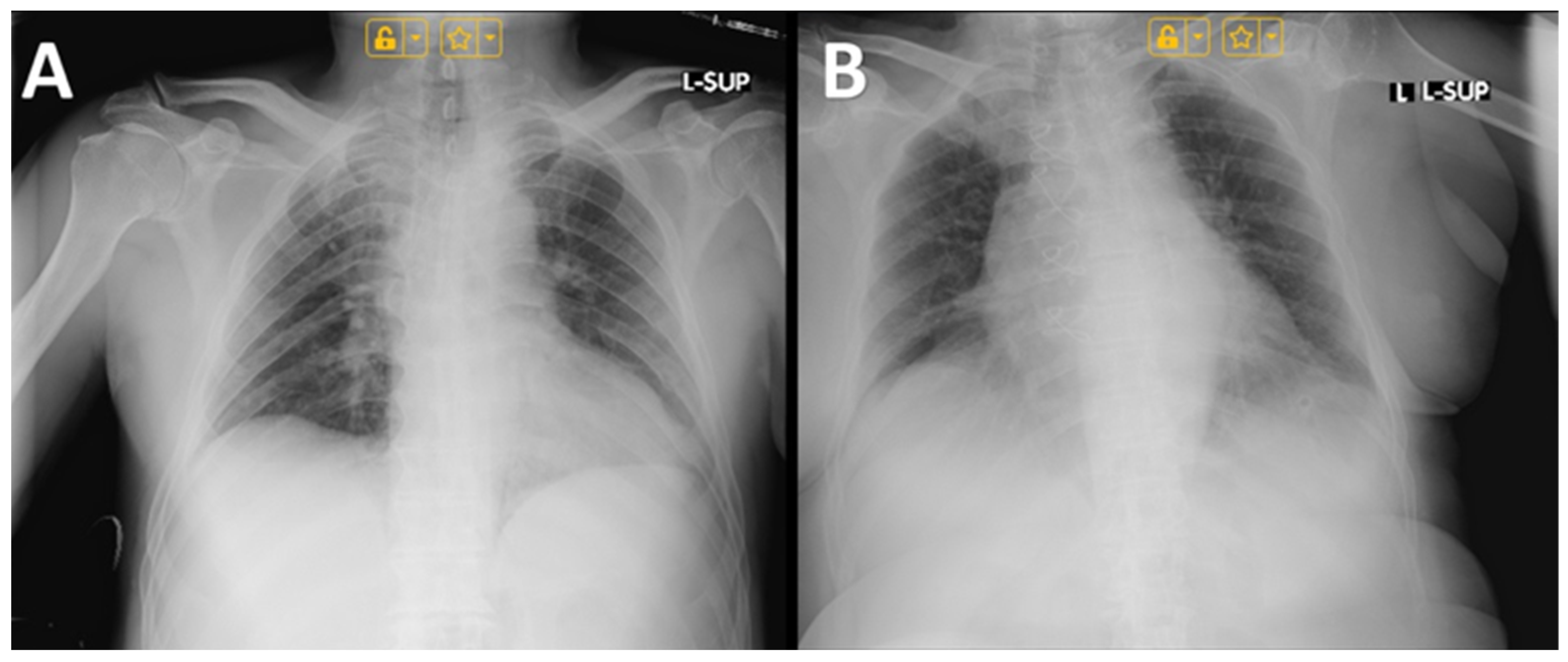 The imaging studies performed in the male patient revealed congested pulmonary hila, most likely reflecting transient circulatory stasis within the pulmonary microcirculation (Figure 4A). Such a finding may result from temporary cardiovascular compromise, including hemodynamic alterations induced by severe intoxication, aggressive intravenous fluid therapy, and forced diuresis [32,33,34,35]. The absence of definitive infiltrative lesions argues against a pneumonic process, suggesting functional-dynamic changes rather than structural damage [36]. In the female patient, imaging indicated minimal pleural effusions without evidence of pulmonary infiltrates (Figure 4B). This observation can be interpreted as a reactive pleural response, likely related to hydrostatic imbalance or increased capillary permeability secondary to systemic intoxication. The absence of infiltrates supports the conclusion that these findings do not represent bacterial infection but rather a secondary, transient manifestation of severe toxic and metabolic stress [37].