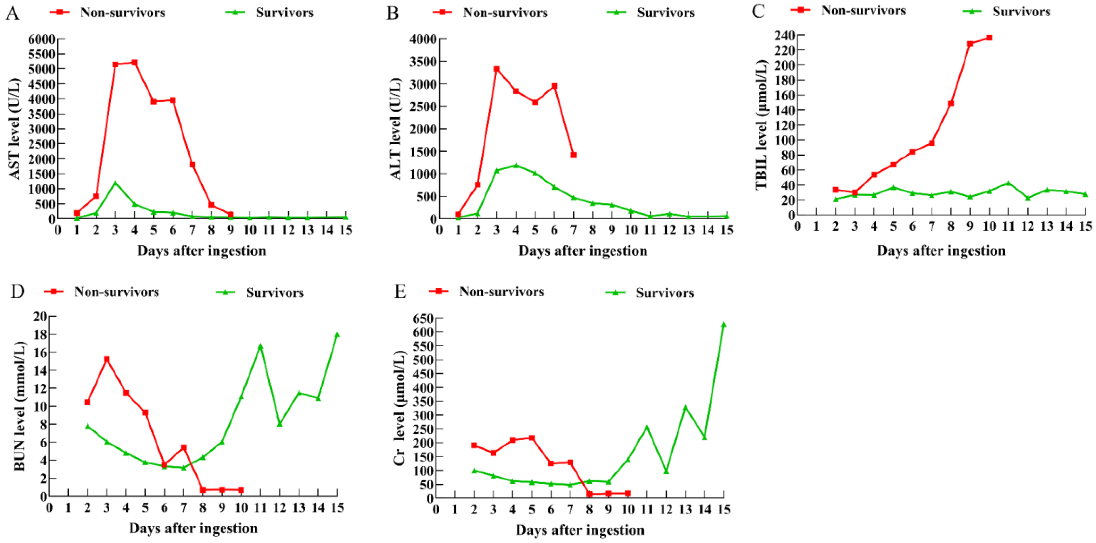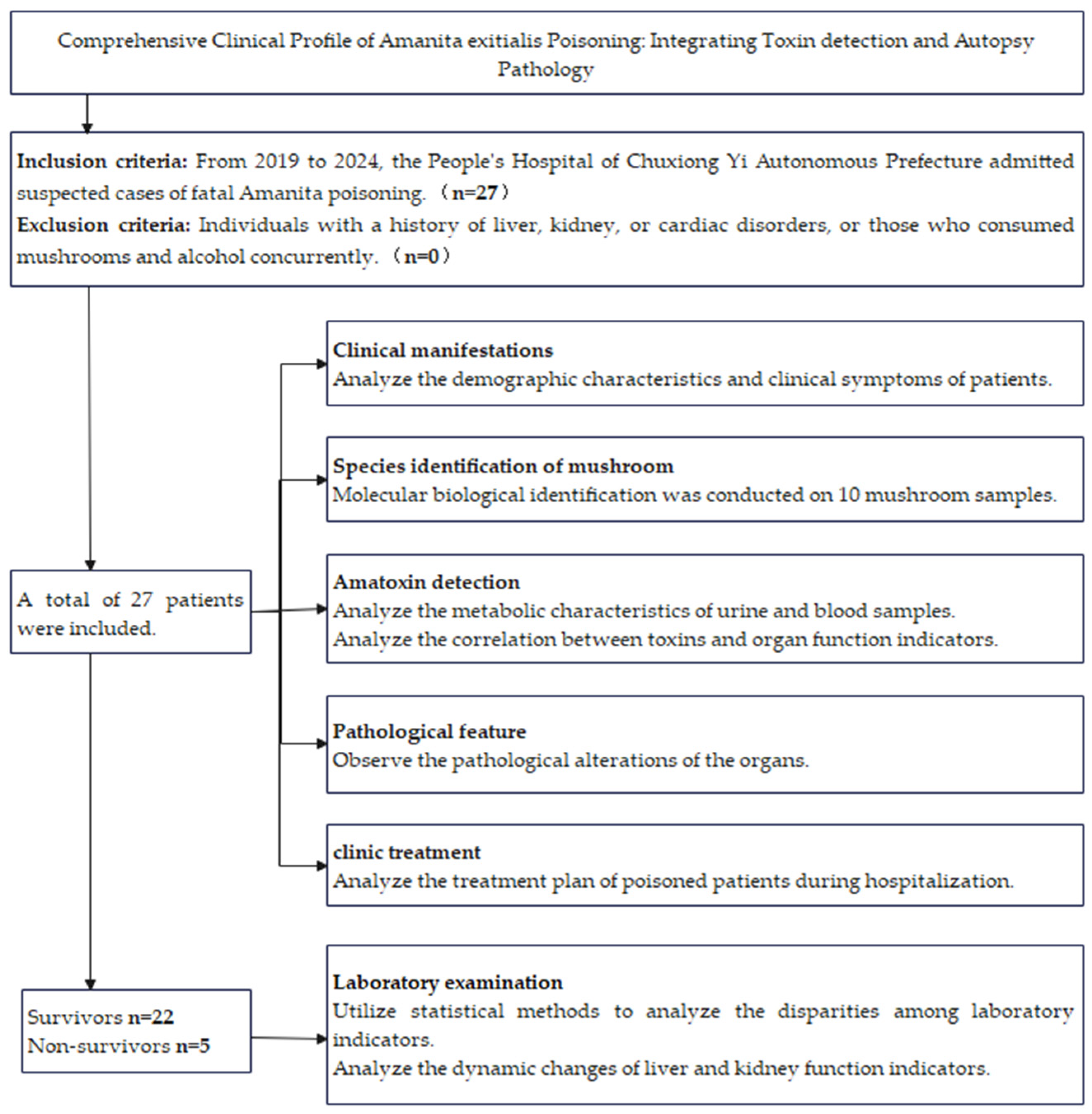 Chen, C.-G.; Xu, P.; Li, J.-P.; Bi, X.-L.; Yao, Q.-M.; Yu, C.-M.; Tang, Y.; Sun, C.-Y.; Wu, Z.-J.; Zhong, J.-J.; et al. Comprehensive Clinical Profile of Amanita exitialis Poisoning: Integrating Toxin Detection and Autopsy Pathology. Toxins 2025, 17, 576. https://doi.org/10.3390/toxins17120576