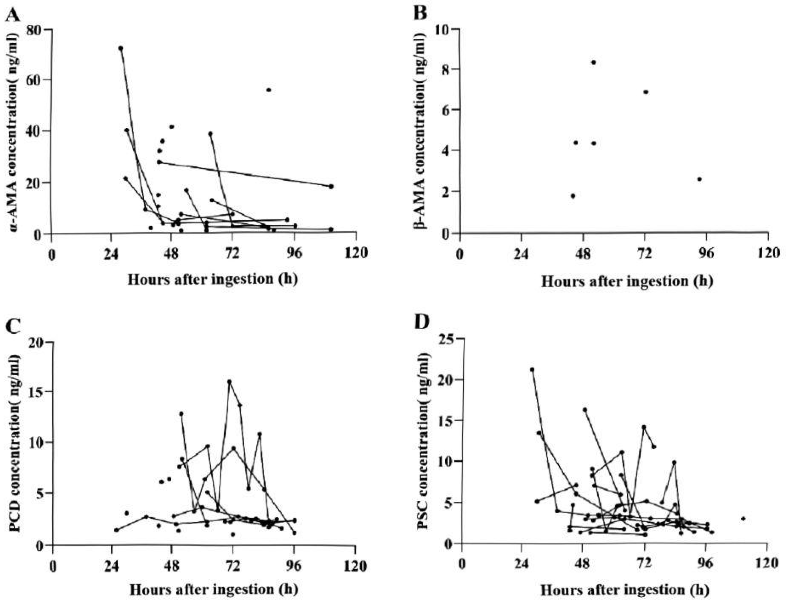 - Yang, S.; Wen, D.; Zheng, F.S.; Pu, S.B.; Chen, Z.N.; Chen, M.B.; Di, B.; Liu, W.; Shi, Y. Simple and rapid detection of three amatoxins and three phallotoxins in human body fluids by UPLC-MS-MS and its application in 15 poisoning cases. J. Anal. Toxicol. 2024, 48, 44–53. [Google Scholar] [CrossRef] [PubMed]