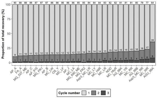 Proportional contribution of individual cycles to the total recovery. The percentage recovery for each cycle is annotated above its respective bar.