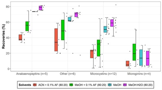 Ultrasonic-assisted extraction recoveries for four cyanopeptides groups across four extraction solvent conditions. The value n represents the number of analytes included in each group. The median is denoted by a horizontal line within each box. Data points beyond the boxplots represent statistical outliers, while whisker extensions correspond to 1.5 times the interquartile range.