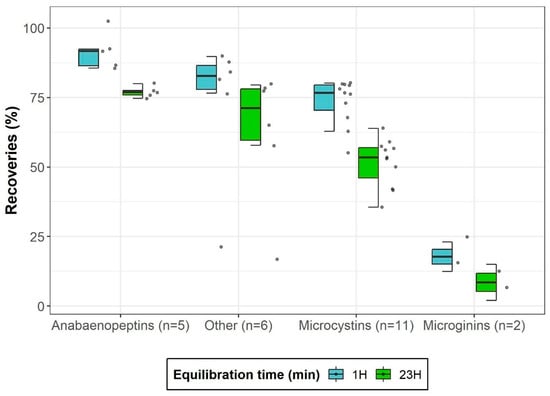 Ultrasonic-assisted extraction recoveries in liver for four cyanopeptide groups after two equilibration times. The value n represents the number of analytes included in each group. The median is denoted by a horizontal line within each box. Data points beyond the boxplots represent statistical outliers, while whisker extensions correspond to 1.5 times the interquartile range.