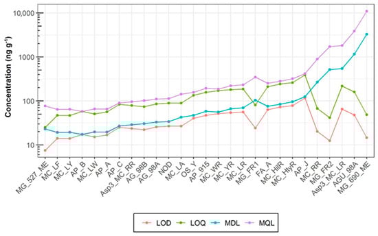Matrix-matched correction with pooled samples was applied to account for recovery differences and matrix effects, ensuring accurate quantification of analytes across different tissue types. Most analytes displayed relative standard deviations (RSD) below 10%, indicating good repeatability, with higher variability for [Asp3]MC-RR (RSD 12.09% in muscle, 18.43% in liver) and MG-527-ME (RSD 19.85% in muscle), likely due to strong matrix effects and low recoveries. Accuracy showed generally acceptable limits (better than 20%), though MC-RR in liver showed a high positive bias (24.52%), while MG-690-ME in muscle had a strong negative bias (−37.45%). Matrix-matched correction helped mitigate signal variations, improving overall method reliability. Despite these challenges, the method demonstrated robustness for quantifying cyanopeptides in fish tissue, particularly in muscle, where variability was lower compared to liver. Figure S9 shows the calibration curves compared in the solvent, the matrix, and the matrix-matched corrected curve for key compounds in the study where the results of signal suppression and enhancement can be observed. All linearity values were satisfactory, with the coefficient of determination (R2) exceeding 0.998 (Table S1). Method limits of quantification (MQLs) were below 0.1 ng g−1 for 8 analytes and below 0.5 ng g−1 for 19 analytes (Figure 5), where the compounds showing the highest quantification limits (LOQ > 1 ng g−1) were the most affected by matrix effects (MG-690-ME, AGU-98A, and [Asp3]MC-RR). Analytes with a large gap between LOQ and MQL tend to have low absolute recoveries, which may be due to matrix effects or incomplete recovery.
