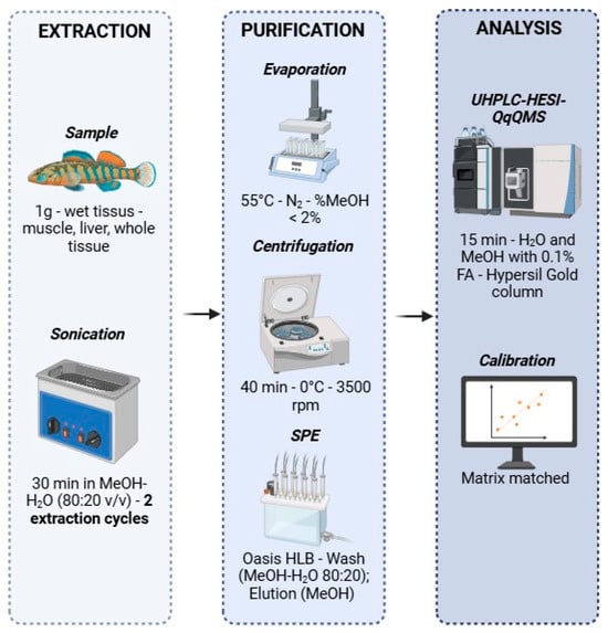 The optimal extraction conditions were: 1 g of thawed, ground wet matrix is placed in a 40 mL amber glass tube, and 10 mL of MeOH-H2O (80:20 v/v) is added. The mixture is vortexed for 30 s to enhance the contact between the extraction solvent and the matrix, then sonicated for 10 min and allowed to sediment for 10 min. The supernatant is collected and transferred to a 10 mL centrifuge tube. This process is then centrifuged with a Sorvall Legend RT+ centrifuge from Thermo Fisher Scientific (Pittsburgh, PA, USA) for 40 min at 3500 rpm and 0 °C. The supernatant is recovered, and these steps are repeated a total of three times for muscle tissue and two times for liver tissue.