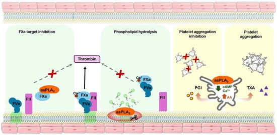 Regarding platelets, the earliest studies in this area focused primarily on evaluating platelet lysis and surface phospholipid cleavage induced by sPLA2 [21]. However, the first evidence on the interference with platelet functionality was reported by Chap and colleagues (1977) [22], showing that a sPLA2 isolated from Naja naja venom could induce platelet aggregation [22]. To date, various other SVPLA2s have been shown to induce or inhibit platelet aggregation, with mechanisms involving formation of arachidonic acid-derived products from sPLA2 phospholipid catalysis [23]. Regarding anticoagulant sPLA2s, not all can modulate platelet function; however, they share the same mechanisms mentioned.