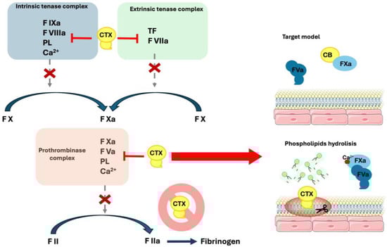 Apart from the prothrombin complex, Gimenez and colleagues [6] also demonstrated that CTX was capable of inhibiting extrinsic tenase complex activity. The toxin presented a high potency in inhibiting tissue factor (coagulation factor III) and factor VII complex’s capacity to activate coagulation factor X into FXa, higher when compared to the intrinsic tenase complex (FIX, FVIII, Ca2+ and PL) or prothrombinase complex (FXa, FVa, Ca2+ and PL). Another interesting finding demonstrated by the authors was that CTX was not capable of inhibiting isolated thrombin (activated factor II—FIIa) activity.