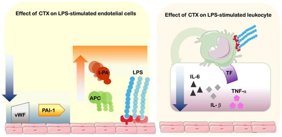 In another approach involving coagulation–inflammation crosstalk, de Andrade and colleagues [8] have performed in vitro cell culture experiments evaluating the effect of CTX on LPS-stimulated endothelial cells’ expression of hemostatic-involved molecules. Cells pretreated with CTX prior to LPS stimulation were found to express less von Willebrand factor (vWF), responsible for mediating platelet adhesion to vascular injury sites, along with the stabilizing of circulating coagulation factor VIII, playing a critical role in hemostasis and vascular integrity [46]. Moreover, CTX was responsible for impairing the reduction production of Protein C from LPS-treated endothelial cells. Protein C is a vitamin K–dependent anticoagulant that inactivates factors Va and VIIIa, reducing clot formation [47]. Regarding the fibrinolysis pathway, the authors also assessed the expression of tissue plasminogen activator (t-PA), which converts plasminogen into plasmin to promote fibrin clot degradation, and plasminogen activator inhibitor-1 (PAI-1), which inhibits t-PA, thereby regulating fibrinolysis and maintaining hemostatic balance. The results demonstrated that LPS-stimulated cells showed an increase in PAI-1 and a decrease in t-PA activity, and CTX was capable of inhibiting these alterations.