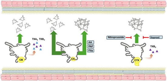 However, Landucci and colleagues [7] observed that CTX complex is capable of inducing aggregation of washed human platelets. This effect was significantly inhibited by sodium nitroprusside and iloprost, known modulators of intracellular cGMP and cAMP pathways. Moreover, the authors observed that during platelet aggregation a substantial production of thromboxane B2 (TXB2) was found; however, pre-treatment with indomethacin, a cyclooxygenase inhibitor, drastically reduces TXB2 formation but not the platelet aggregation. Considering the results, authors have suggested that CTX-induced aggregation does not result from direct phospholipid hydrolysis, although arachidonic acid metabolites are produced, but rather from activation via specific intracellular signaling mechanisms [7] (Figure 5).