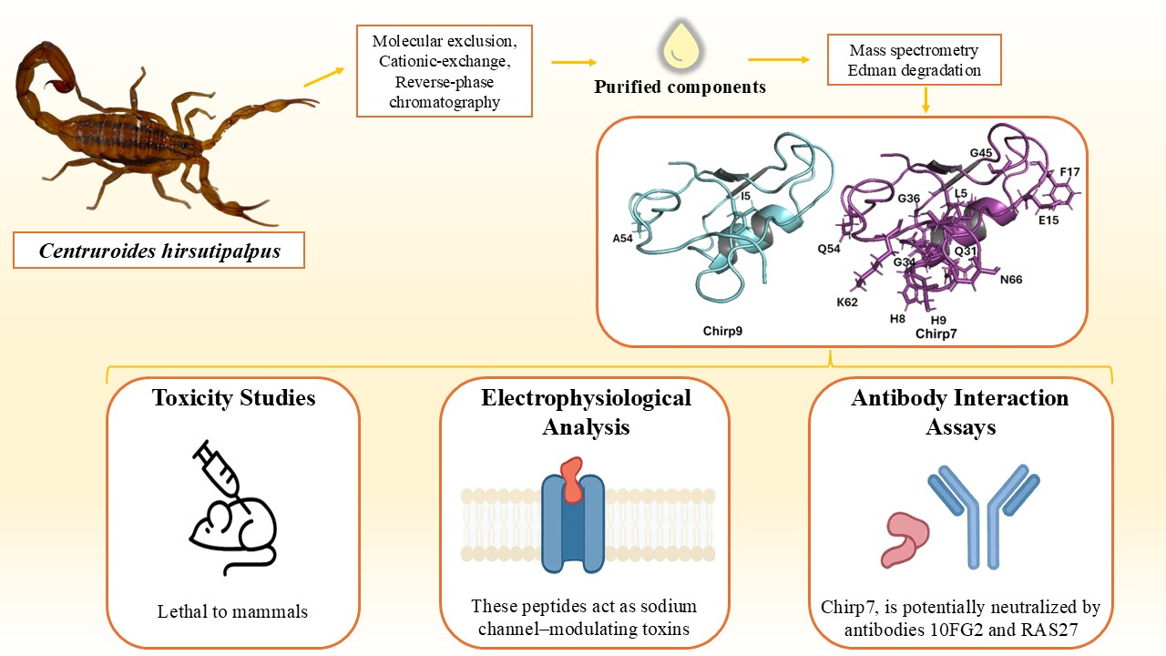This study enabled the identification and characterization of two beta-type sodium toxins from the venom of Centruroides hirsutipalpus. These toxins, Chirp7 and Chirp9, exhibited modulatory activity on voltage-gated sodium channels and demonstrated lethality in mammals, confirming their biomedical relevance. Structural and functional analyses, including mass spectrometry, Edman degradation sequencing, electrophysiological studies, and antibody interaction assays, provided robust evidence of their role in scorpion envenomation and reinforced the value of these peptides as tools for ion channel research and as potential targets for the development of more specific antivenoms.