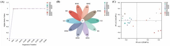 Analysis of fungal community diversity and abundance. (A) Rarefaction curves of all samples. (B) Petal diagram of shared and unique ASVs of all samples. (C) PCoA analysis based on Bray–Curtis distance.