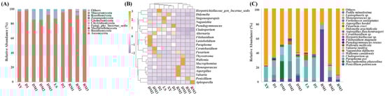 Fungal community composition analyses. (A) Phylum-level taxonomic composition of fungal community. (B) Heatmap of the relative abundance of the top 20 most abundant genera in all samples. (C) Composition of the top 20 most abundant fungal species at the species level.