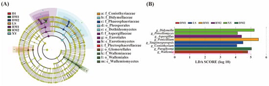 Linear discriminant analysis. (A) Significantly enriched fungal taxa showed by cladograms based on LEfSe analysis. (B) Scores for the significantly enriched fungal genera showed by bar chart based on LEfSe analysis.