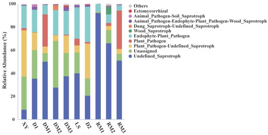 Based on FUNGuild analysis, saprotrophic fungi dominated the fungal community in samples stored for more than one month (Figure 4). The relative abundances of undefined saprotrophs reached 92.02%, 65.91%, and 50.73% in RM1, RM2, and RM3, respectively. Plant pathogenic fungi showed a marked increase in DM1 and RM3. In conclusion, storage for more than one month significantly increased the potential risk of contamination of Polygalae Radix by plant pathogenic and saprotrophic fungi.
