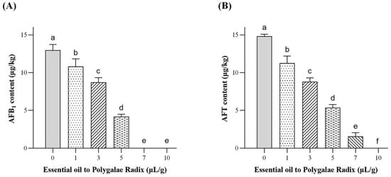 Effects of different PEO dosages on AFB1 and AFT levels in Polygalae Radix. (A) AFB1 content in each treatment group. (B) AFT content in each treatment group. Different lowercase letters indicate significant differences. Data were analyzed by one-way ANOVA followed by Tukey’s multiple comparison test. Different lowercase letters indicate significant differences (p < 0.05).