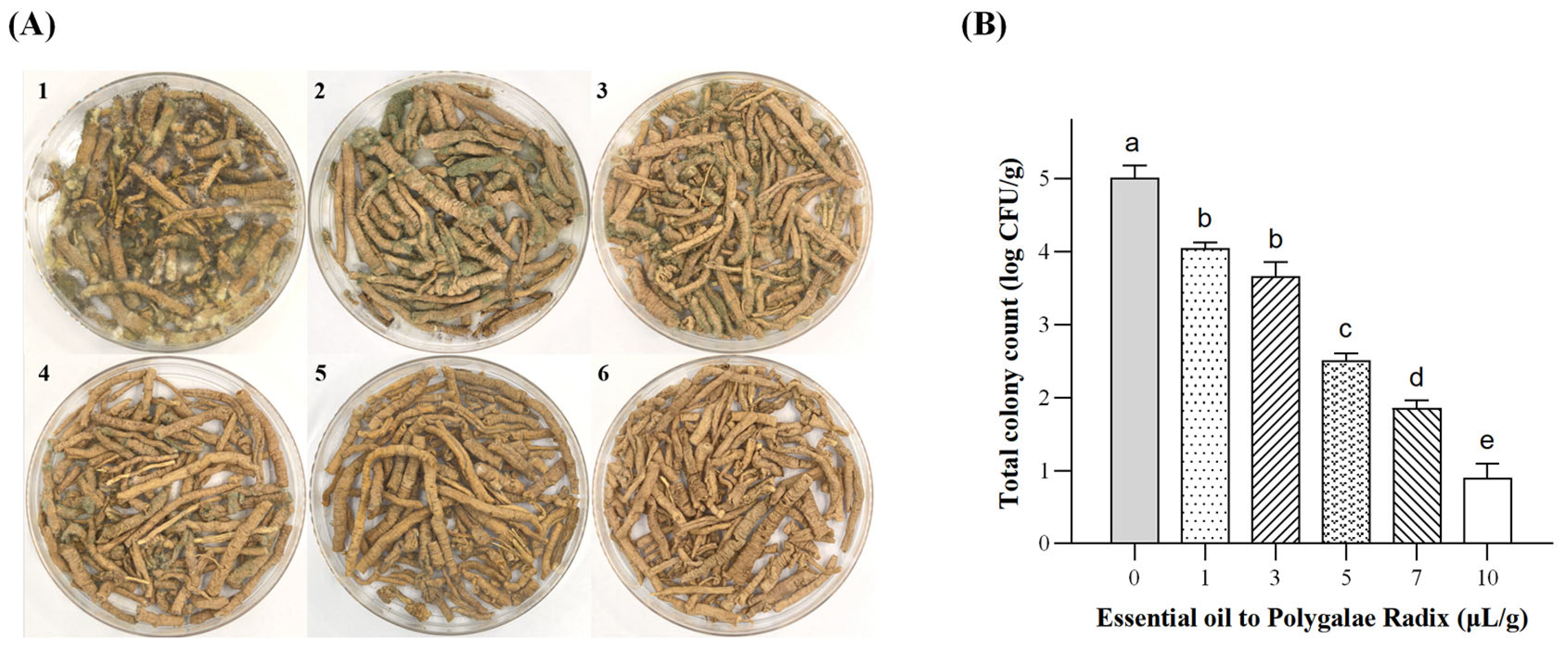 Effects of different PEO dosages on A. flavus growth in Polygalae Radix. (A) Growth status of A. flavus in each treatment group (1: control group without PEO; 2–6: 1, 3, 5, 7, and 10 μL/g PEO, respectively). (B) Log-transformed total colony counts of A. flavus in each treatment group. Different lowercase letters indicate significant differences. Data were analyzed by one-way ANOVA followed by Tukey’s multiple comparison test. Different lowercase letters indicate significant differences (p < 0.05).