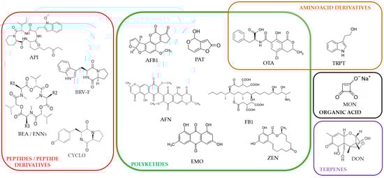 Chemical structures of the regulated and non-regulated food-associated mycotoxins tested in this study: aflatoxin B1 (AFB1), apicidin (API), 56 aurofusarin (AFN), beauvericin (BEA), brevianamide-F (BRV-F), cyclo-(L-Pro-L-Tyr) (CYCLO), deoxynivalenol (DON), emodin (EMO), enniatins (ENNs), fumonisin B1 (FB1), moniliformin (MON), ochratoxin A (OTA), patulin (PAT), tryptophol (TRPT), and zearalenone (ZEN).