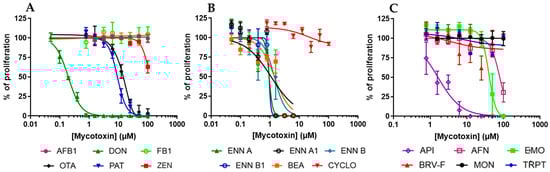 Regarding the non-regulated mycotoxins, the data showed that ENNs and BEA were the most active, with IC50 values ranging from 0.92 ± 1.07 to 1.41 ± 0.20 µM (Figure 2B). AFN, API, and EMO were also found to inhibit the proliferation of EGCs with IC50 values of 79.51 ± 3.68, 1.63 ± 0.21, and 40.01 ± 2.70 µM, respectively. On the contrary, CYCLO, BRV-F, MON, and TRPT did not affect cell division for concentrations up to 100 µM (Figure 2C).
