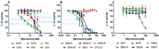 The effect of mycotoxins on EGC viability was then measured by exposing confluent/non-dividing EGCs to increasing concentrations of toxins for 48 h, allowing the determination of their cytotoxic concentration 50% values (CC50) (i.e., the concentrations causing a 50% decrease in cell viability) (Figure 3 and Table 2). Among regulated mycotoxins (Figure 3A), DON, OTA, PAT, and ZEN decreased cell viability, giving CC50 of 5.06 ± 0.48, 23.88 ± 1.36, 38.02 ± 11.37, and 31.75 ± 4.94 µM, respectively. Regarding the non-regulated mycotoxins (Figure 3B,C), only API (CC50 value of 59.59 ± 10.27 µM) and the cyclohexadepsipeptides (ENNs and BEA) inhibited EGC viability with CC50 values ranging from 0.72 ± 0.16 to 2.14 ± 0.17 µM. The other regulated or non-regulated mycotoxins tested (i.e., AFB1, AFN, BRV-F, CYCLO, EMO, FB1, MON, and TRPT) did not cause cytotoxicity at concentrations up to 100 µM.