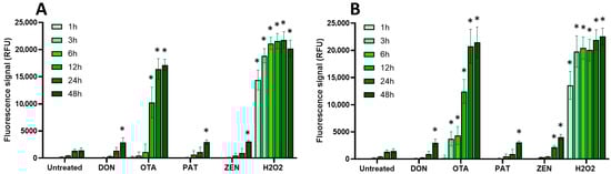 Among the regulated mycotoxins toxic to EGCs, OTA, both at 25 µM (a concentration close to its CC50 on EGC viability) and at 100 µM, caused the most significant increase in the production of intracellular radical oxygen species (ROS), with signals comparable to those caused by H2O2 used as a positive control (Figure 4). At 25 µM, the effect of OTA on ROS production started after 12 h exposure and was maximal at 24–48 h after exposure, whereas at 100 µM of OTA, significant ROS production was observed as soon as 3 h after exposure. The other regulated mycotoxins found to be toxic to EGCss (i.e., DON, PAT, and ZEN) also caused ROS production but with a lower effect and only after 48 h of exposure (except for ZEN at 100 µM, where a significant increase was observed after 24 h of exposure).