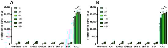 Effect of non-regulated mycotoxins on ROS production of EGCs. Confluent EGCs were loaded with DCFDA probe (25 µM) to detect intracellular ROS. Loaded cells were then exposed to non-regulated mycotoxins shown to be toxic to EGCs at concentrations close to their CC50 on cell viability (i.e., 60 µM of API, 1 µM of ENN A, A1 or B, 2 µM of ENN B1 or BEA) (A) or at 100 µM (B). H2O2 at 500 µM final concentration was used as a positive control for the induction of intracellular ROS production. After various exposure times, fluorescence was measured (Ex 485 nm/Em 535 nm). Results are expressed as means ± SD (n = 3). * p < 0.05 compared with control cells without mycotoxin at the same time.