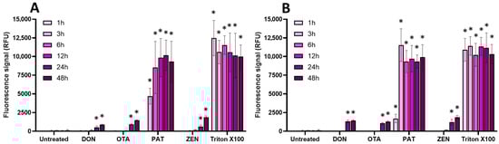 Regarding regulated mycotoxins (Figure 6), PAT (at its CC50 and at 100 µM) was the only one to cause a significant membrane permeabilization (similar to the positive control Triton X-100), starting after 1 h of incubation and maximal at 3–6 h. This is in agreement with previous data showing that PAT compromises membrane integrity [30]. DON, OTA, and ZEN were much less potent at causing membrane damage, with only a weak but still significant effect after 24 h of incubation.