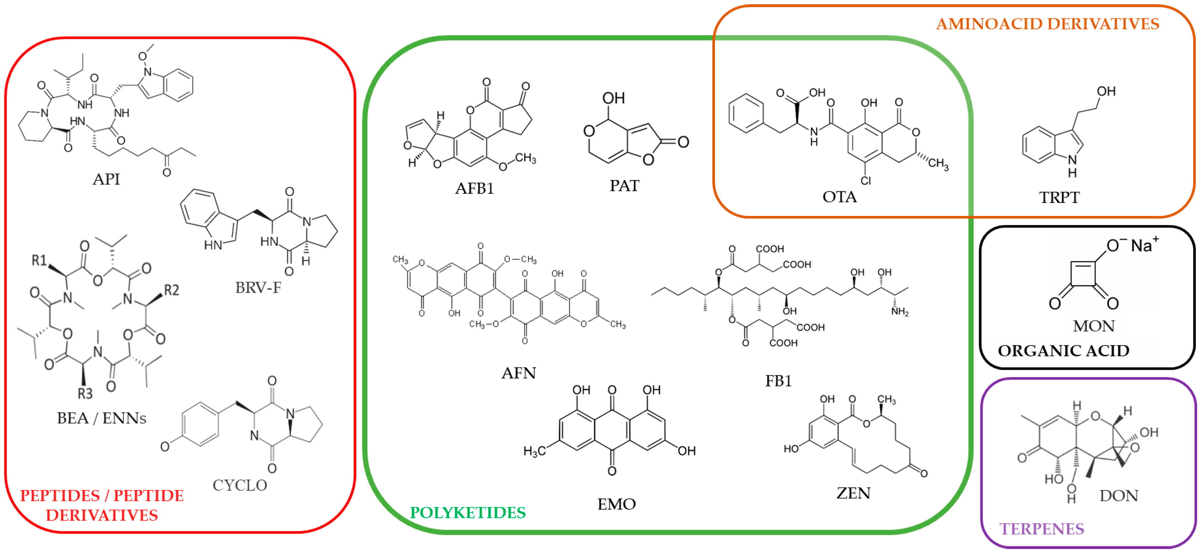 - Frisvad, J.C.; Thrane, U.; Samson, R.A.; Pitt, J.I. Important mycotoxins and the fungi which produce them. Adv. Exp. Med. Biol. 2006, 571, 3–31. [Google Scholar] [CrossRef] [PubMed]