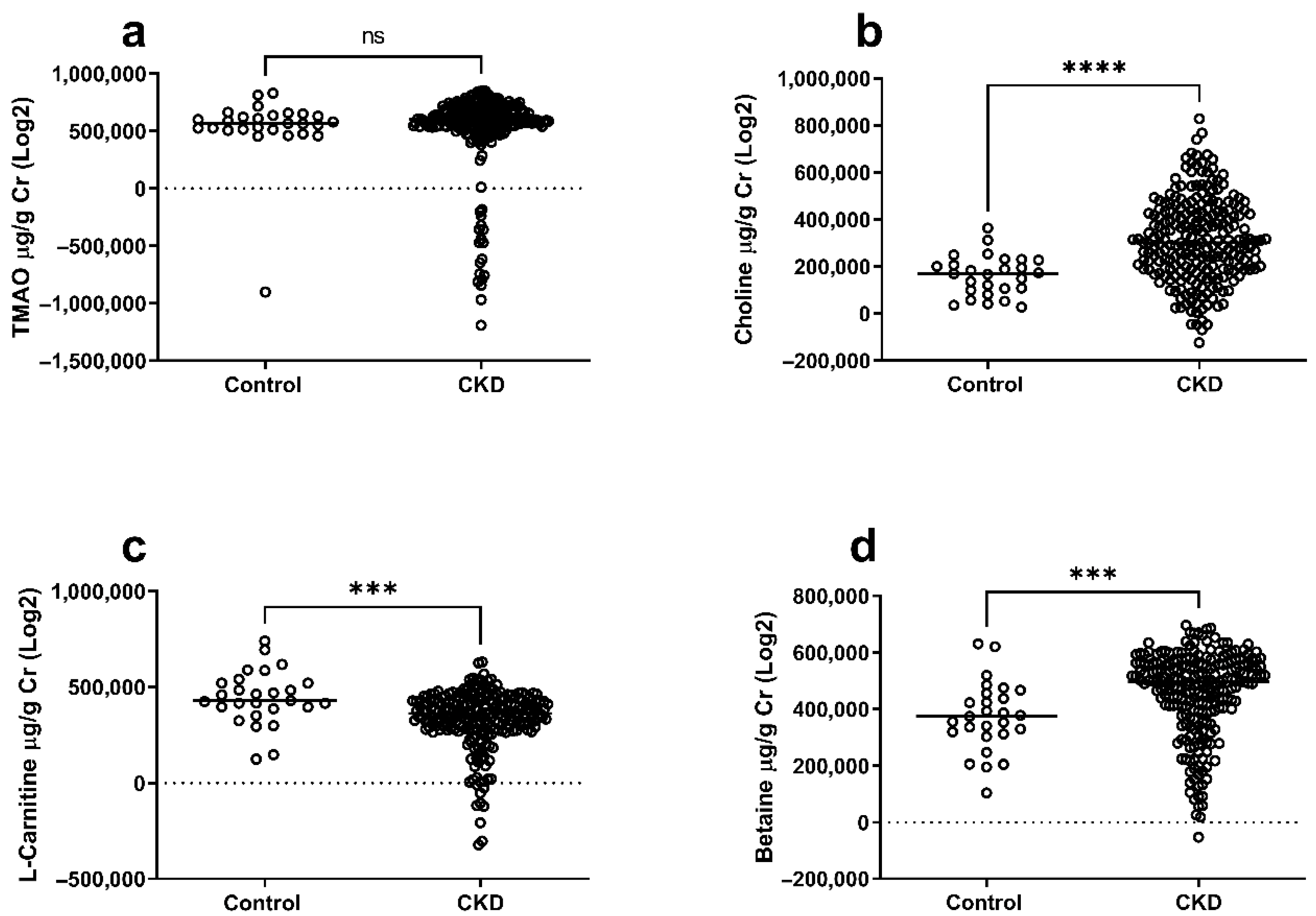 - Liu, J.J.; Liu, S.; Gurung, R.L.; Lee, J.; Zheng, H.L.; Ang, K.; Chan, C.; Lee, L.S.; Han, S.R.; Kovalik, J.P.; et al. Urine Choline Oxidation Metabolites Predict Chronic Kidney Disease Progression in Patients With Type 2 Diabetes. J. Clin. Endocr. Metab. 2025, dgaf281. [Google Scholar] [CrossRef]