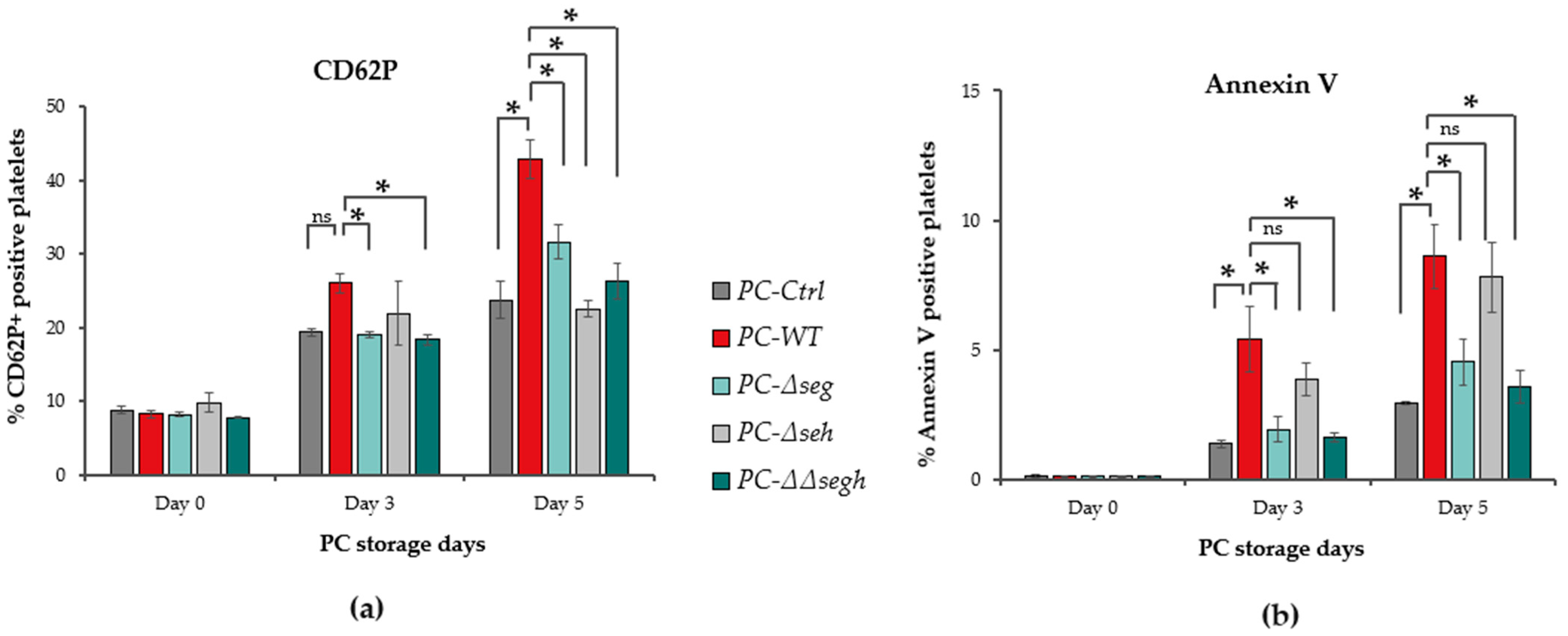 2.1. Staphylococcus aureus Heightens Platelet Activation During Storage of S. aureus-Contaminated PCs