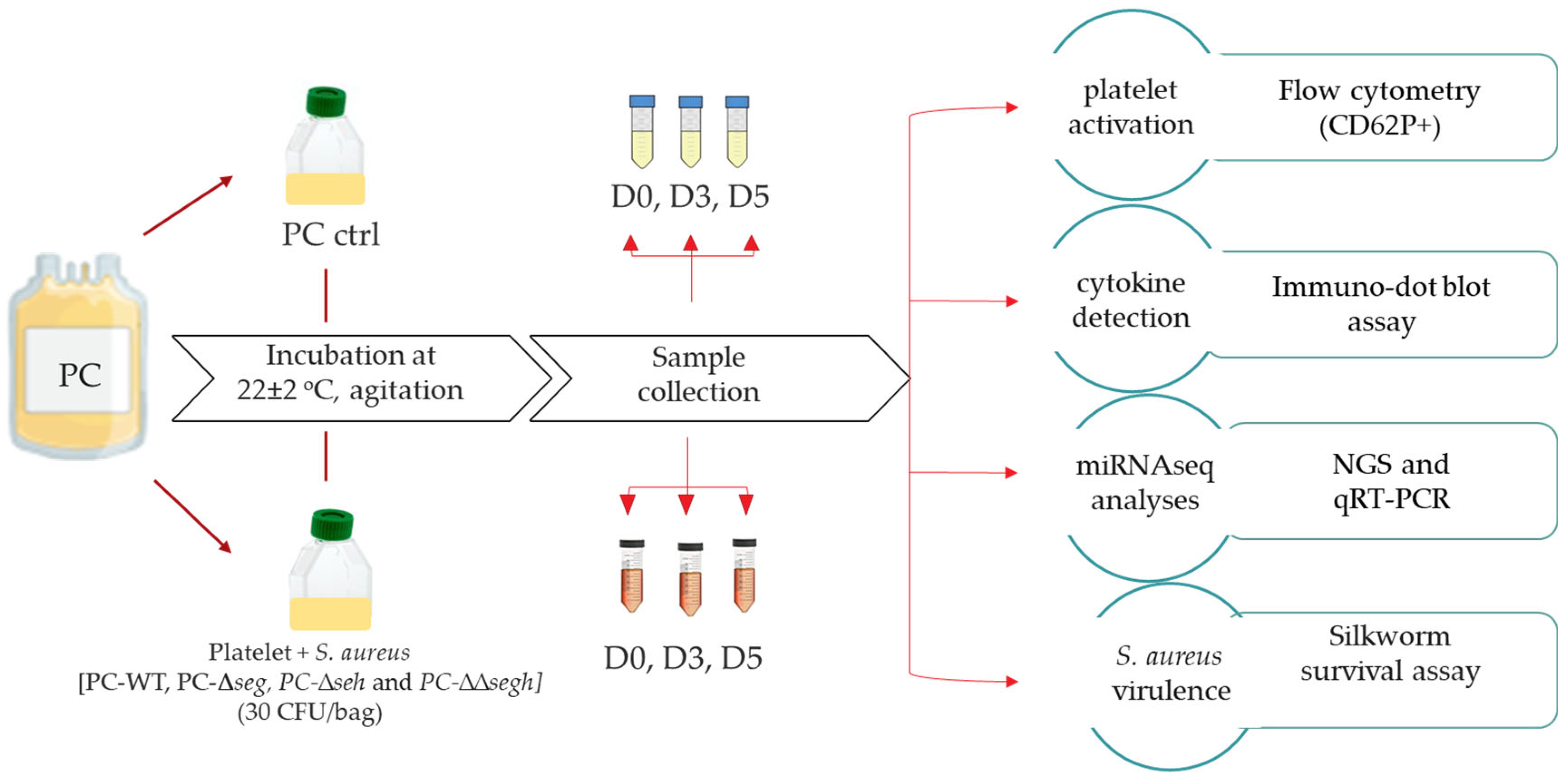 - Yousuf, B.; Pasha, R.; Pineault, N.; Ramirez-Arcos, S. Modulation of Staphylococcus aureus gene expression during proliferation in platelet concentrates with focus on virulence and platelet functionality. PLoS ONE 2024, 19, e0307920. [Google Scholar] [CrossRef]
