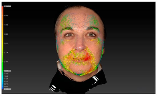 Three-dimensional surface imaging was performed using the Vectra H2® system, capturing standardized images of each subject at rest and during maximal eyebrow elevation. The images were then superimposed using the Vectra Software Suite® 5.4 (Canfield Scientific Inc.®, Parsippany, NJ, USA). The software’s vector-tracking algorithm automatically identifies corresponding surface landmarks across both image sets and computes the displacement of each point in three dimensions. This algorithm quantifies skin movement by calculating vector magnitude (in millimeters) and direction across the forehead surface, producing an objective and reproducible map of regional motion. All analyses were performed retrospectively by the same investigator (K.F.) to ensure methodological consistency and minimize inter-observer variability.