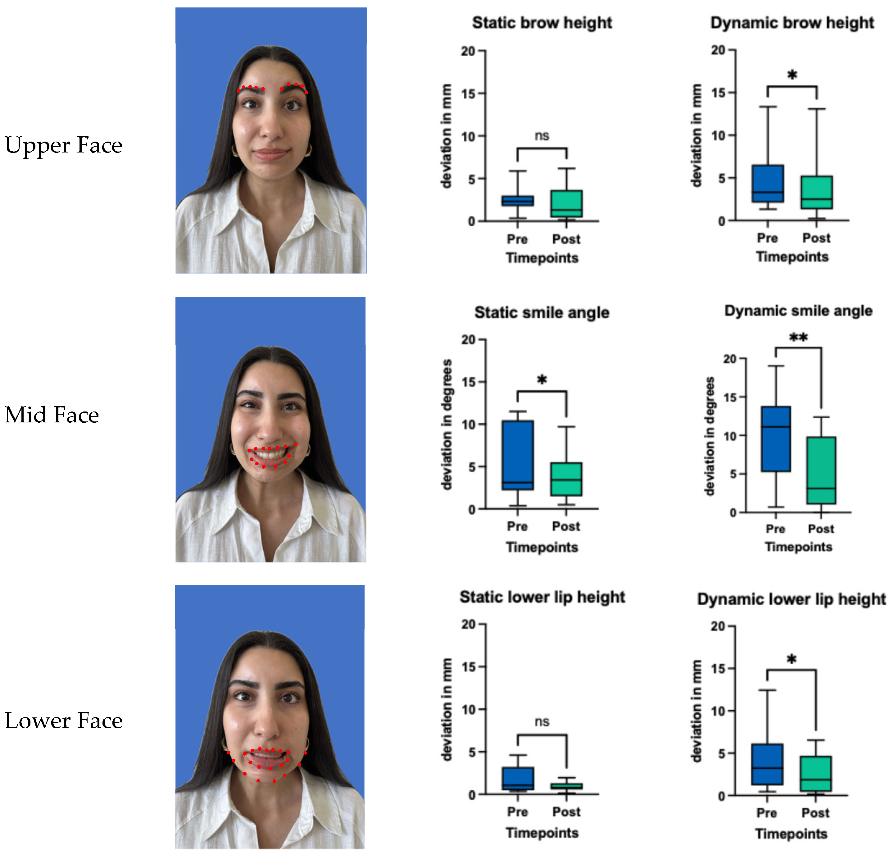 | Mid Face | Smile angle deviation (degree) | Before | Rest | 3.11 mm | 0.12 to 3.34 | 0.024 |