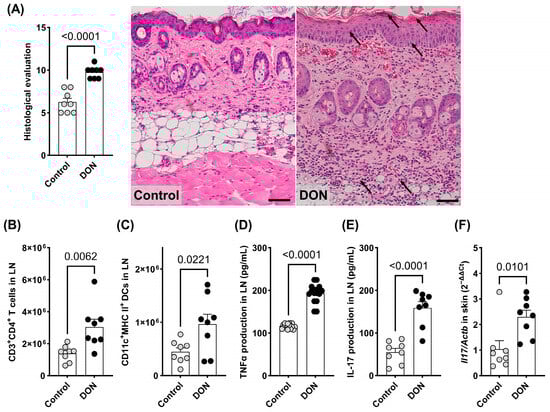 Total histological evaluation scores and typical histological images of back skin. Arrows indicate inflammatory cell infiltration in the epidermis and dermis for hyperplasia. (A). Effects of DON on immune functions, including the infiltration of CD3+CD4+ T cells (B) and CD11c+MHC class II+ dendritic cells (C) in auricular lymph nodes, and the secretion of TNF-α (D) and IL-17 (E) (pg/mL) by T cells. The gene expression of IL-17 in back skin samples was evaluated using the qPCR method (F). The results are presented as the mean ± SEM (n = 8 per group). p < 0.05 (unpaired t-test) vs. the imiquimod control group. LN = lymph node; TNF = tumor necrosis factor; IL = interleukin.