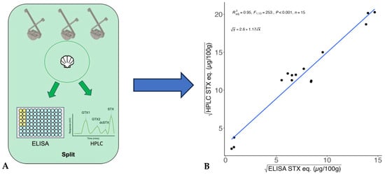 There was one clam with a below detectable limit (BDL) value using the ELISA, whereas its HPLC concentration was 86 µg STX eq. 100 g−1. The contribution of STX to this clam’s PSTs was ~39%, which should have been detectable on this ELISA, resulting in its exclusion from the linear regression analysis. False negatives have been documented in other clams using the Abraxis kit, which were mostly due to clams containing an abundance of congeners that were not detectable by the kit, such as GTX 1 and 4 [29,30]. This outlier sample did have a significant abundance of GTX 1 and 4 (~31%), which could have resulted in the false negative. This result demonstrates that high-throughput studies assessing STX eq. in clams using ELISAs would benefit from allocating a subset of clams for QA/QC purposes using HPLC methods. Additionally, the outlier clam shows that the model will underestimate total toxicity if it is applied to clams that exhibit different PST congener profiles to those that were included in the linear model analysis (Figure 1A,B).