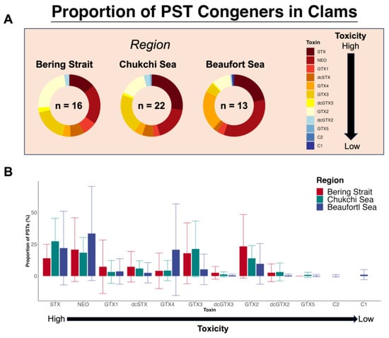 (A–B): (A) Overall regional comparison of mean proportions (i.e., relative molarity; [%] of each congener) of paralytic shellfish congeners (red–blue scale bar) in Arctic clams. Sample sizes (n) for each region are located inside donut plots. (B) Variation in each congener present in each region. Specifically, the mean ±1 SD congener abundances (relative molarity; [%] of each congener) measured in Arctic clams are plotted by region (red: Bering Strait; green: Chukchi Sea; purple: Beaufort Sea). Congeners are ranked from high to low toxicity (black arrows) based on their toxicity equivalency factors (TEFs, Table 2).