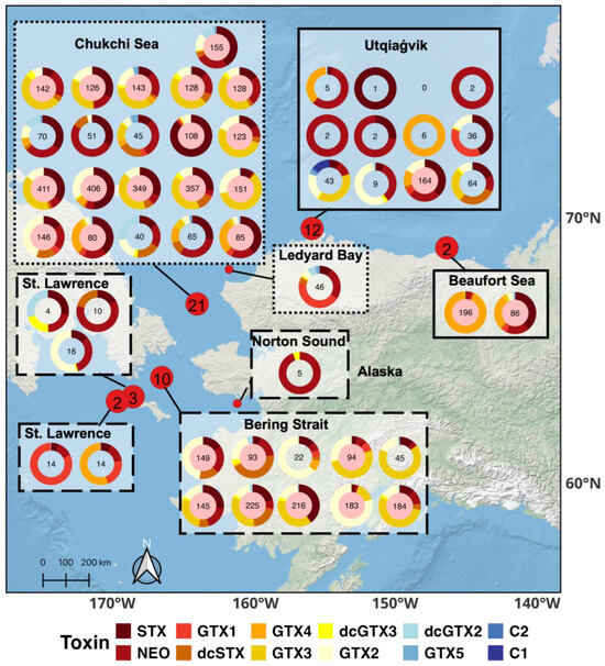 Map of all clams’ (n = 52) paralytic shellfish toxin (PST) congener profiles (i.e., relative molarity [%] of each congener) from HPLC analysis with the total toxicity concentration (µg STX eq. 100 g−1) of each clam contained inside the donut plot. Each congener in each PST profile was converted to STX eq. concentrations using toxicity equivalency factors (TEFs, Table 2) and then added together for each clam, resulting in their total toxicity concentration (µg STX eq. 100 g−1). Red points on the map depict locations where clams were collected and number inside each point correlates to the number of clams collected in that area. Borders of boxes reflect the region each clam was collected from, including the Bering Strait (long-dashed borders, n = 16), Chukchi Sea (short-dashed borders, n = 22), and Beaufort Sea (solid-line borders, n = 14). Donut plots with red centers are clams with total PST concentrations above the seafood regulatory limit (≥80 µg STX eq. 100 g−1).