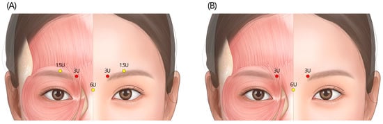 - Kim, Y.J.; Lim, O.K.; Choi, W.J. Are there differences between intradermal and intramuscular injections of botulinum toxin on the forehead? Dermatol. Surg. 2020, 46, e126–e131. [Google Scholar] [CrossRef]