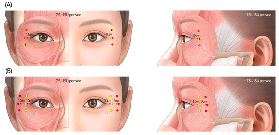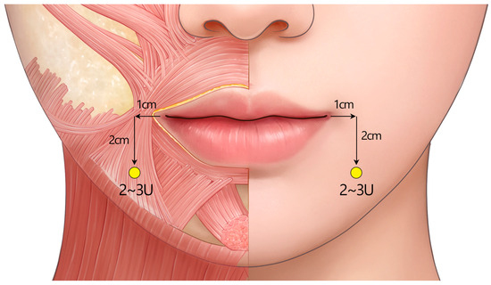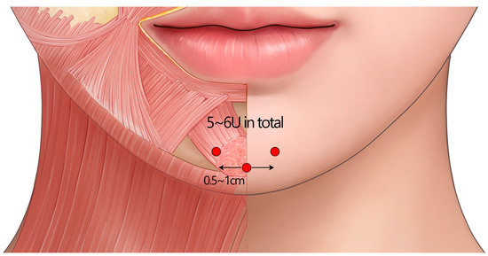 - Kim, H.J.; Seo, K.K.; Lee, H.K.; Kim, J. Clinical anatomy for botulinum toxin injection. In Clinical Anatomy of the Face for Filler and Botulinum Toxin Injection; Kim, H.J., Seo, K.K., Eds.; Springer: Singapore, 2016; pp. 55–92. [Google Scholar] [CrossRef]