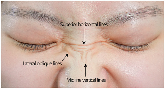 - Kim, H.S.; Kim, C.; Cho, H.; Hwang, J.Y.; Kim, Y.S. A study on glabellar wrinkle patterns in Koreans. J. Eur. Acad. Dermatol. Venereol. 2014, 28, 1332–1339. [Google Scholar] [CrossRef]