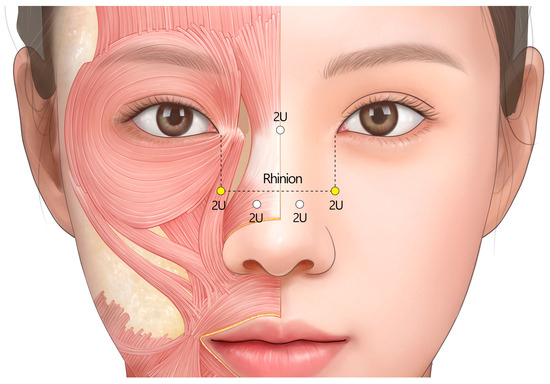 - Yi, K.H.; Lee, J.H.; Hu, H.W.; Kim, H.J. Novel anatomical guidelines on botulinum neurotoxin injection for wrinkles in the nose region. Toxins 2022, 14, 342. [Google Scholar] [CrossRef]