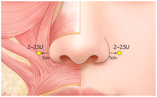- Lee, W.; Ahn, T.; Cheon, G.; Lee, M.; Yang, E. Comparative analysis of botulinum toxin injection after corrective rhinoplasty for deviated nose and alar asymmetry. J. Cosmet. Dermatol. 2021, 20, 451–456. [Google Scholar] [CrossRef] [PubMed]