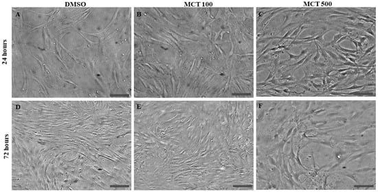 Analysis of brain endothelial cell (BEC) morphology after 24 h and 72 h culture in control conditions (0.5% DMSO) or treated with alkaloid monocrotaline (MCT) by phase-contrast micrograph. (A–C) Photomicrographs after 24 h treatments were taken using objective 20×, scale bar = 100 µm; (C,D) photomicrographs after 72 h treatments were taken using objective 10×, scale bar = 100 µm. (A,D) Control conditions (0.05% DMSO); (B,E) BECs treated with MCT at 100 µM (MCT100); (C,F) BECs treated with MCT at 500 µM (MCT500), respectively. Changes in cell morphology and increase in cell density are evident in treated cultures compared to controls.