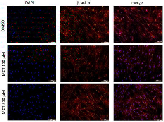 Analysis of brain endothelial cells (BECs) morphology after 24 h in control conditions (0.5% DMSO) or treated with alkaloid monocrotaline (MCT) by immunocytochemistry for the β-actin protein (red). Photomicrograph cultures in control conditions (0.5% DMSO), or after 24 h treatment with MCT at 100 µM or 500 µM; nuclear chromatin was stained by DAPI (blue); objective 20×, scale bar = 100 µm. The disruption of actin filaments and the presence of more cell nuclei are evident in treated cultures compared to the control.