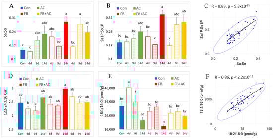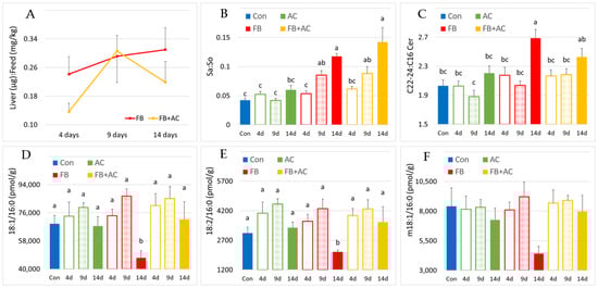 | FB: 2 BW | 9 d (n = 3) | Liver, lung | Increase of Sa:So in liver and lung Decrease of relative abundance of C16 Cer in liver, decreased of C22-24 Cer in lung | [31] |
