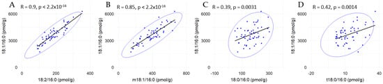 | 18:1/16:0 | 32.9 ± 7.1 bc | 46.3 ± 4.5 a | 35.8 ± 11.6 b | 22.6 ± 4.9 cd | 29.1 ± 7.1 bc | 32.2 ± 4.3 bc | 18.6 ± 2 d | 27.7 ± 6.2 bc | 29 ± 5.1 bc | 25.7 ± 3.5 bc | <0.001 |