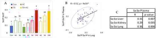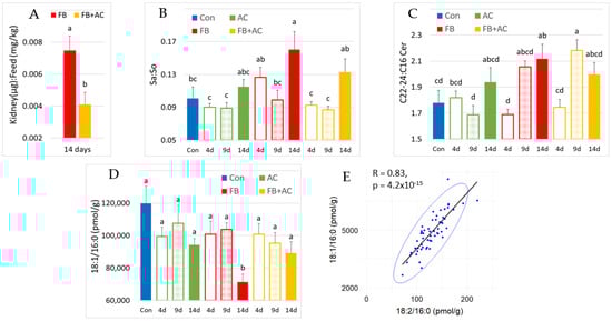 | FB: 5.29 FB + AC: 5.75 | 4, 9, 14 d (n = 6) | Liver, kidney, lung, plasma | FB: FB1 dosed in liver at 4, 9, 14 d, and in kidney at 14 d Sa:So increased at 9 and 14 d in liver and at 14 d in kidney and lung, Sa1P:So1P increased at 14 d in lung and plasma C16-Cer decreased at 14 d in liver, kidney, and lung, C22-24:C16 Cer ratio increased at 14 d in liver and kidney FB + AC: decrease of FB1 by 43% at 4 d and 29% at 14 d in liver, and 45% at 14 d in kidney Sa:So and Sa1P:So1P not different from FB C16-Cer and C22-24:C16 Cer ratio not different from unexposed control | |