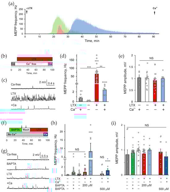 αLTX actions do not require extracellular Ca2+ but strictly depend on intracellular Ca2+. (a) Examples of the effect of 0.5 nM αLTX on the frequency of spontaneous MEPPs in mouse neuromuscular preparations in the absence of Ca2+e, continuously recorded from individual muscle fibers. (b) The control experimental protocol: initial incubation with 2 mM Ca2+e; removal of Ca2+e; addition of 0.5 nM αLTX; reintroduction of 2 mM Ca2+e. (c) Representative Vm recordings during respective experimental stages. (d,e) Mean MEPP frequencies and amplitudes during the experimental stages as indicated below. (f) The Ca2+cyt chelation protocol: initial incubation in a Ca2+e-free buffer; incubation with 200–500 μM BAPTA-AM; two extended washing steps with a Ca2+-free buffer; addition of 0.5 nM αLTX; reintroduction of 2 mM Ca2+e. (g) Representative Vm recordings under the experimental conditions indicated. (h,i) Mean MEPP frequencies and amplitudes during respective experimental stages. The bars are the means ± SEM; the bar colors correspond to protocol phases; the underlying data points are shown as white circles; asterisks show statistical significance compared to Ca2+e-free control, unless indicated by lines; the blue asterisk in (h) compares the values indicated by the two blue bars; *, p < 0.05; **, p < 0.01; ***, p < 0.001; ****, p < 0.0001; NS, non-significant; for each condition shown, n = 9–43 individual muscle fibers, from 3 to 4 independent neuromuscular preparations.