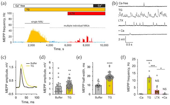 The observation above suggested that αLTX might act by releasing Ca2+ from some intracellular Ca2+ stores. Given the fact that previous publications demonstrated the ability of thapsigargin (TG) to inhibit neurotransmitter exocytosis induced by a mutant toxin, LTXN4C [20,44], we tested whether TG, an inhibitor of the sarcoplasmic–endoplasmic reticulum Ca2+ ATPase (SERCA), could also inhibit the action of the wild-type α-LTX. Application of 10 μM TG to mouse NMJs in the absence of Ca2+e (Figure 2a), induced a strong increase in the frequency of MEPPs that gradually subsided to a lower-than-control level within 10–30 min (Figure 2a,b,f). The effect developed within 2–5 min, with MEPP frequencies reaching ~50 Hz at the peak and 11.8 ± 1.8 Hz on average. TG clearly acted both presynaptically (increasing MEPP frequency) and postsynaptically (raising the amplitude and duration of MEPPs) (Figure 2c–e). Nevertheless, the presynaptic action of TG allowed us to assess the role of presynaptic Ca2+ stores on the action of αLTX.